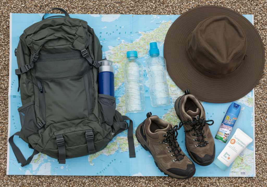 - 雨具: 折りたたみ傘やレインウェアがあると安心。