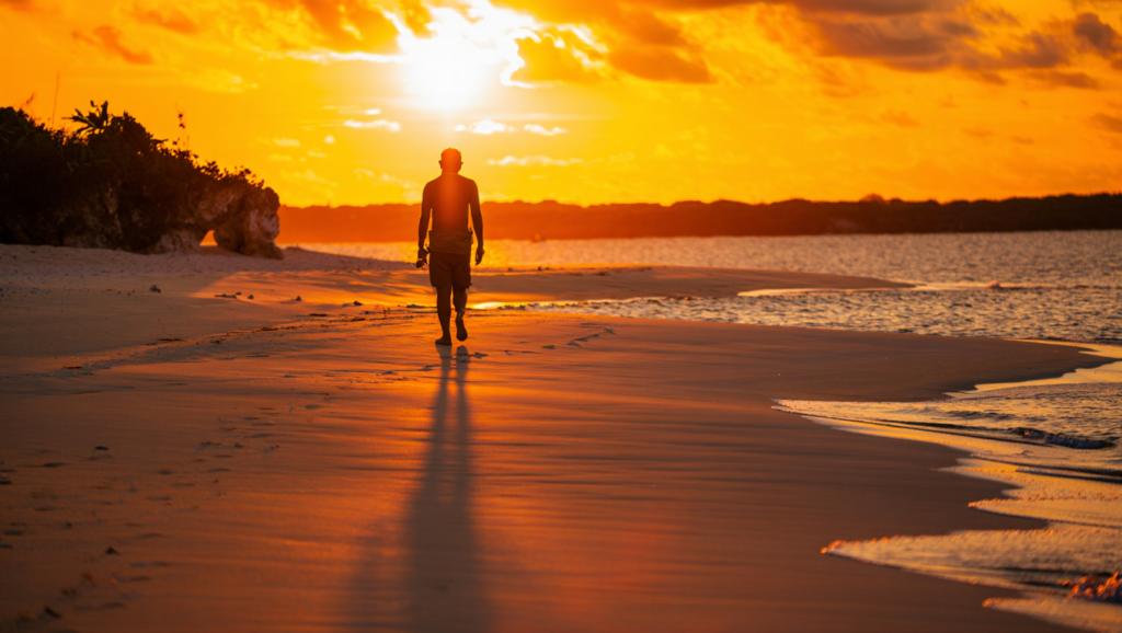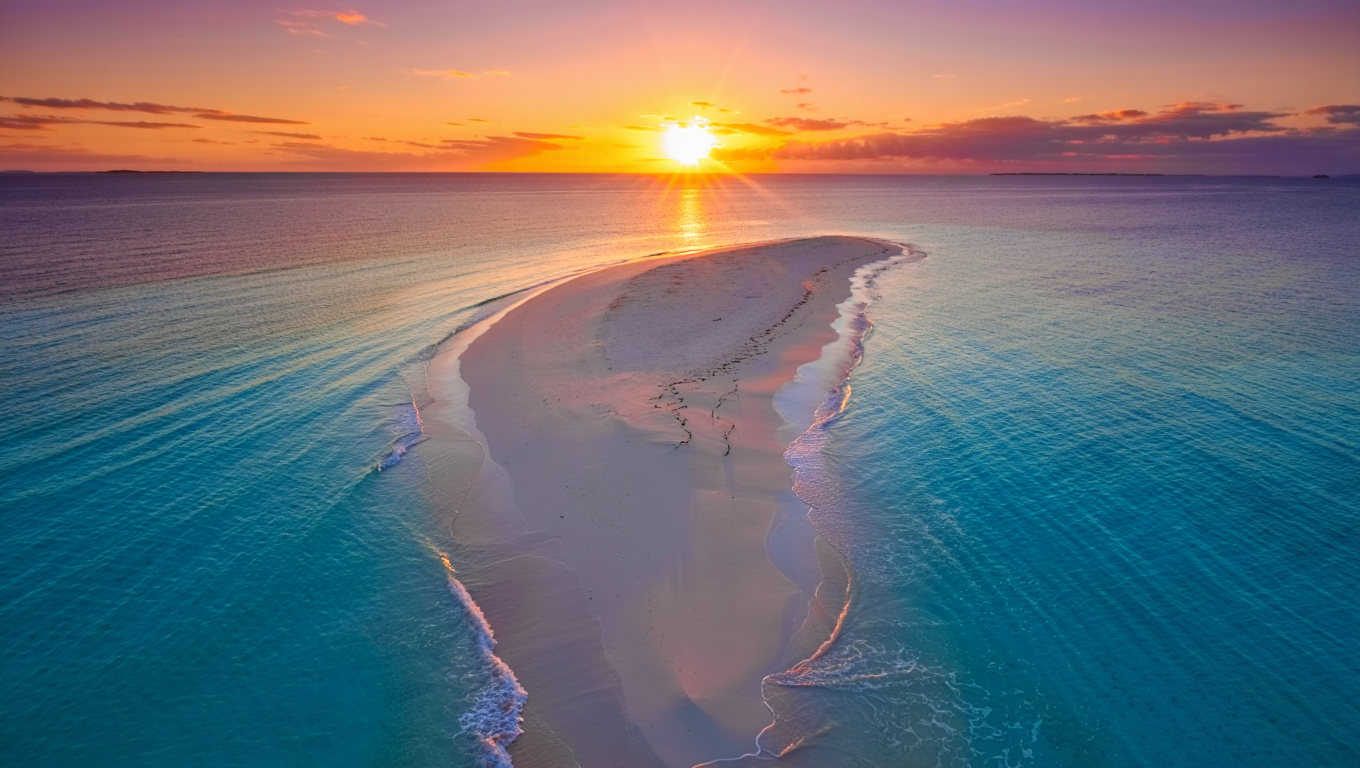 太陽がゆっくりと水平線へ沈み、空と海がオレンジから深い青へと変わっていく――